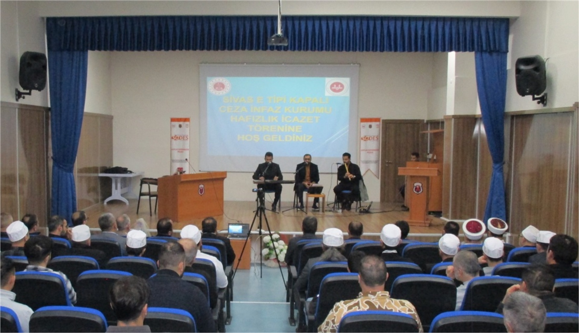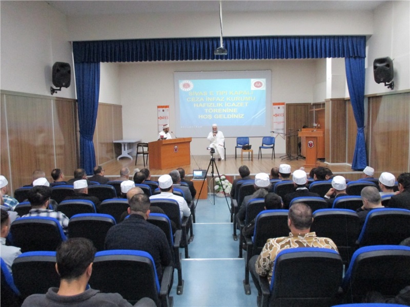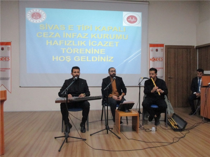 Sivas E Tipi Kapalı Ceza İnfaz Kurumunda düzenlenen Hafızlık İcazet Töreni, Adalet Bakanlığı ve Diyanet İşleri Başkanlığı iş birliği protokolü kapsamında gerçekleştirildi. Hafızlık kursunu başarıyla tamamlayan hükümlü, Diyanet İşleri Başkanlığı tarafından düzenlenen Hafızlık Sınavını geçerek “Hafızlık İcazet Belgesi” almaya hak kazandı. Törene Sivas Cumhuriyet Başsavcı Vekili Murat köksal, Ceza İnfaz Kurumu Savcısı Baray tütüncü, Sivas İl Müftüsü Hasan limon, İl Müftü Yardımcısı Behçet koçak, Kurum Müdürü Mehmet zekioğlu, hükümlüler ve kurum personeli katıldı. Program, saygı duruşu ve İstiklal Marşı ile başladı, Sivas İl Müftülüğü Türk Tasavvuf Musikisi ekibinin ilahileri ve salavatlarıyla devam etti.